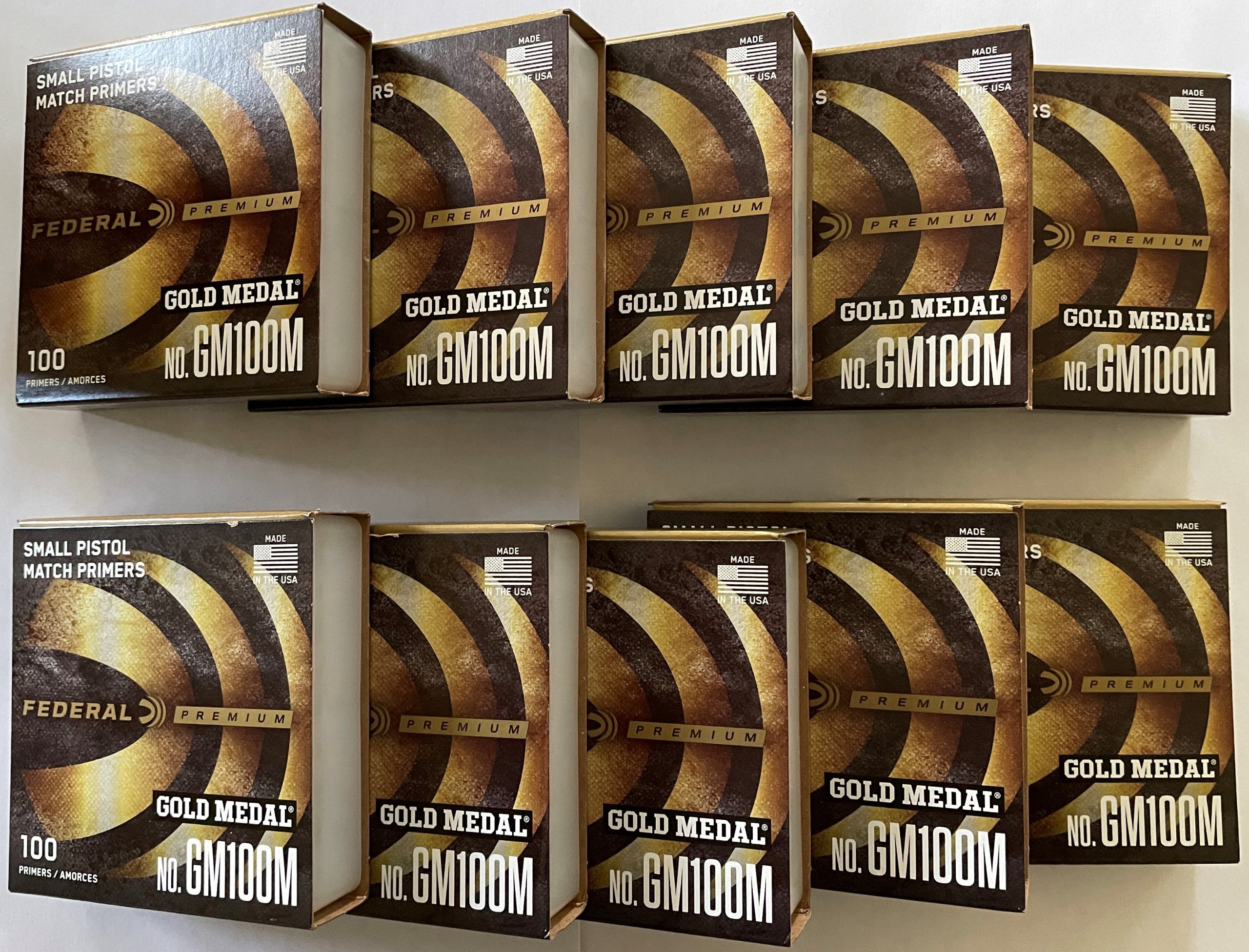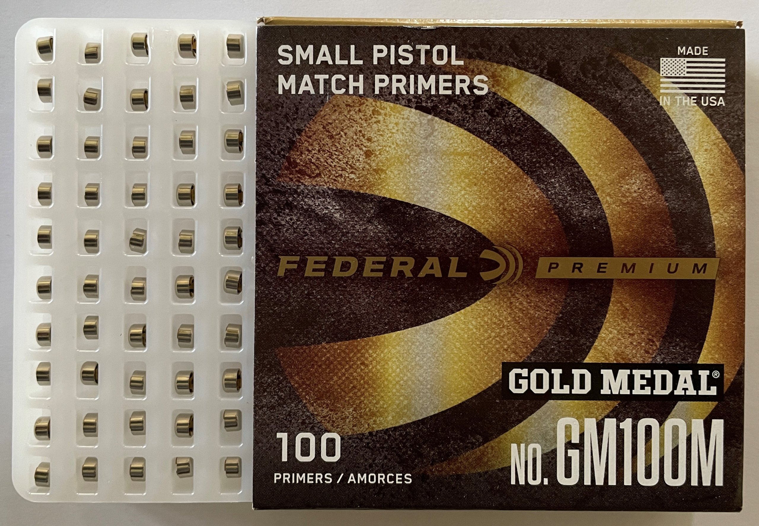 These are newly manufactured Federal Small Pistol Match (No. GM100M) primers. Each sleeve contains 100 primers. 10 sleeves per order.